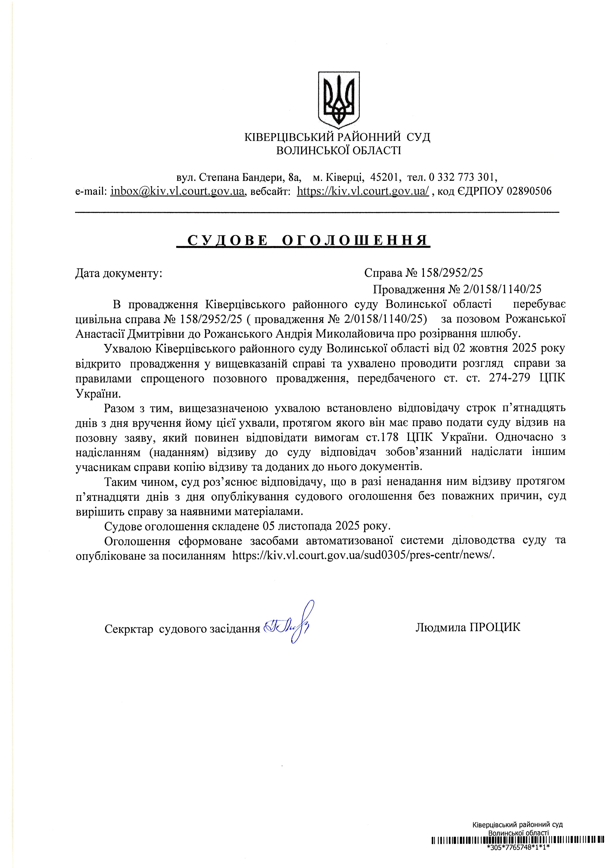 В зв'язку цим, за наступним посиланням https://kiv.vl.court.gov.ua/sud0305/sydovi_ogolochennia/sydovi_ogolochennia7/ розміщено судове оголошення по справі № 158/2952/25. Судове оголошення ТУТ.jpg