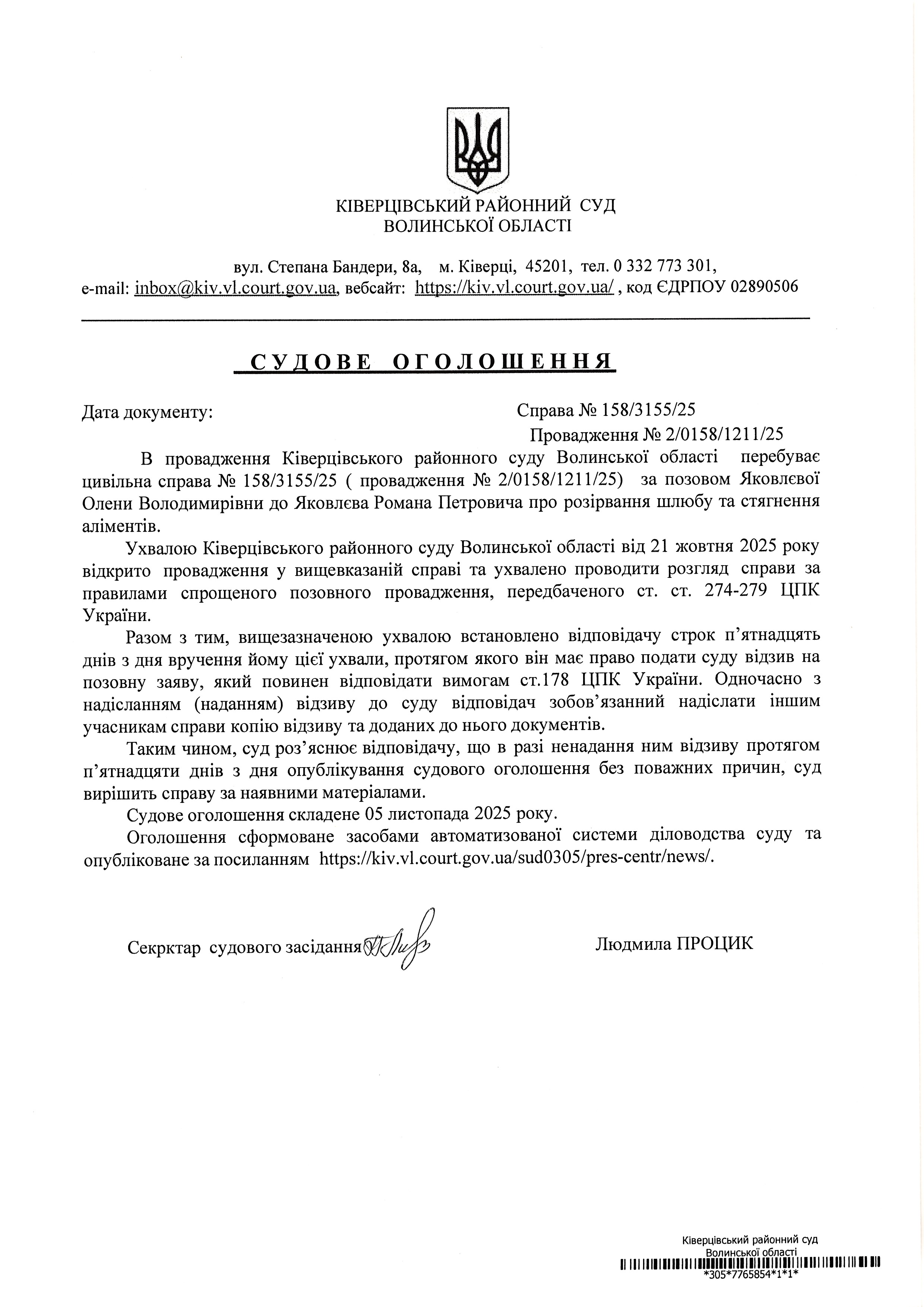В зв'язку цим, за наступним посиланням https://kiv.vl.court.gov.ua/sud0305/sydovi_ogolochennia/sydovi_ogolochennia7/ розміщено судове оголошення по справі № 158/3155/25. Судове оголошення ТУТ.jpg