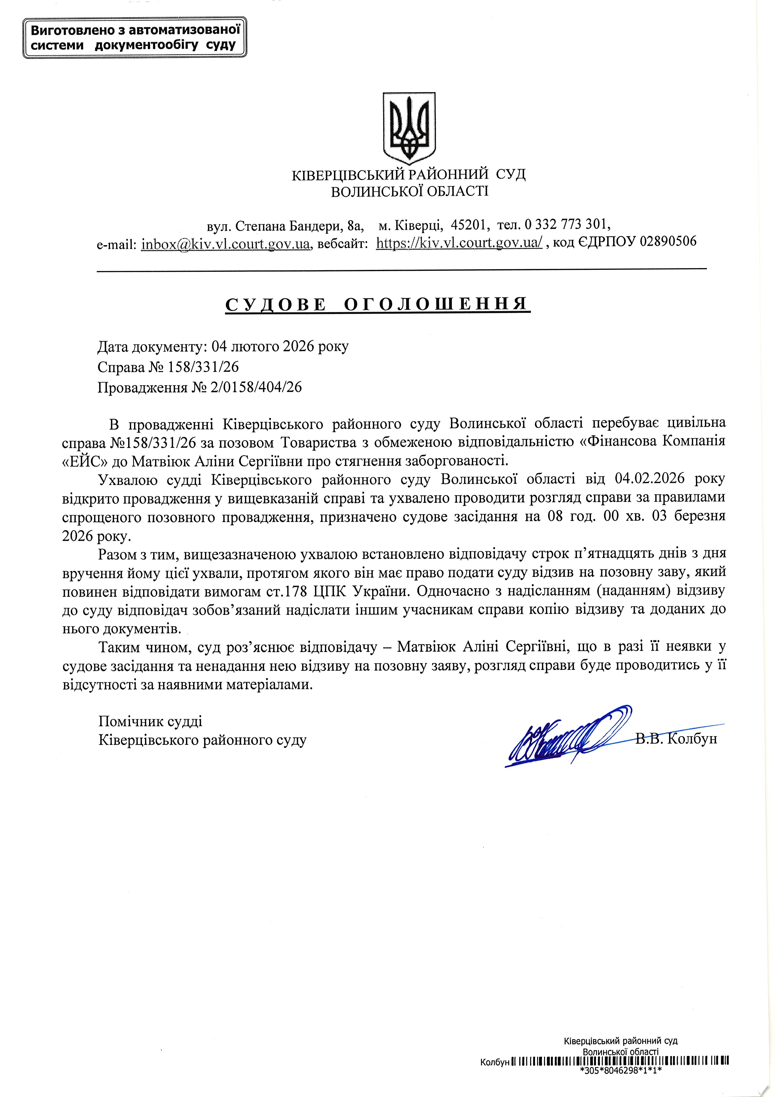 В зв'язку з цим, за наступним посиланням https://kiv.vl.court.gov.ua/sud0305/sydovi_ogolochennia/sydovi_ogolochennia7/ розміщено судове оголошення по справі № 158/331/26. Судове оголошення ТУТ.jpg
